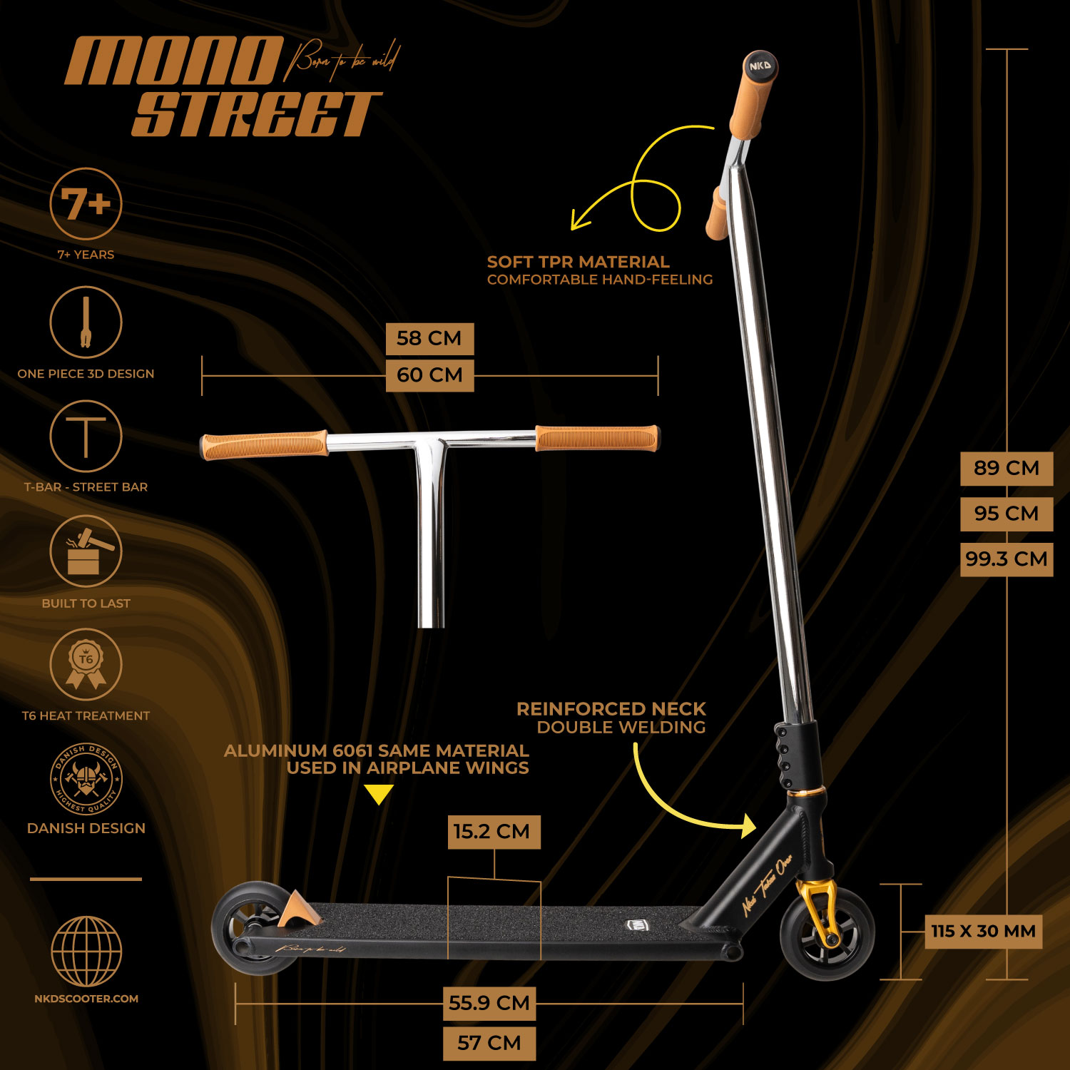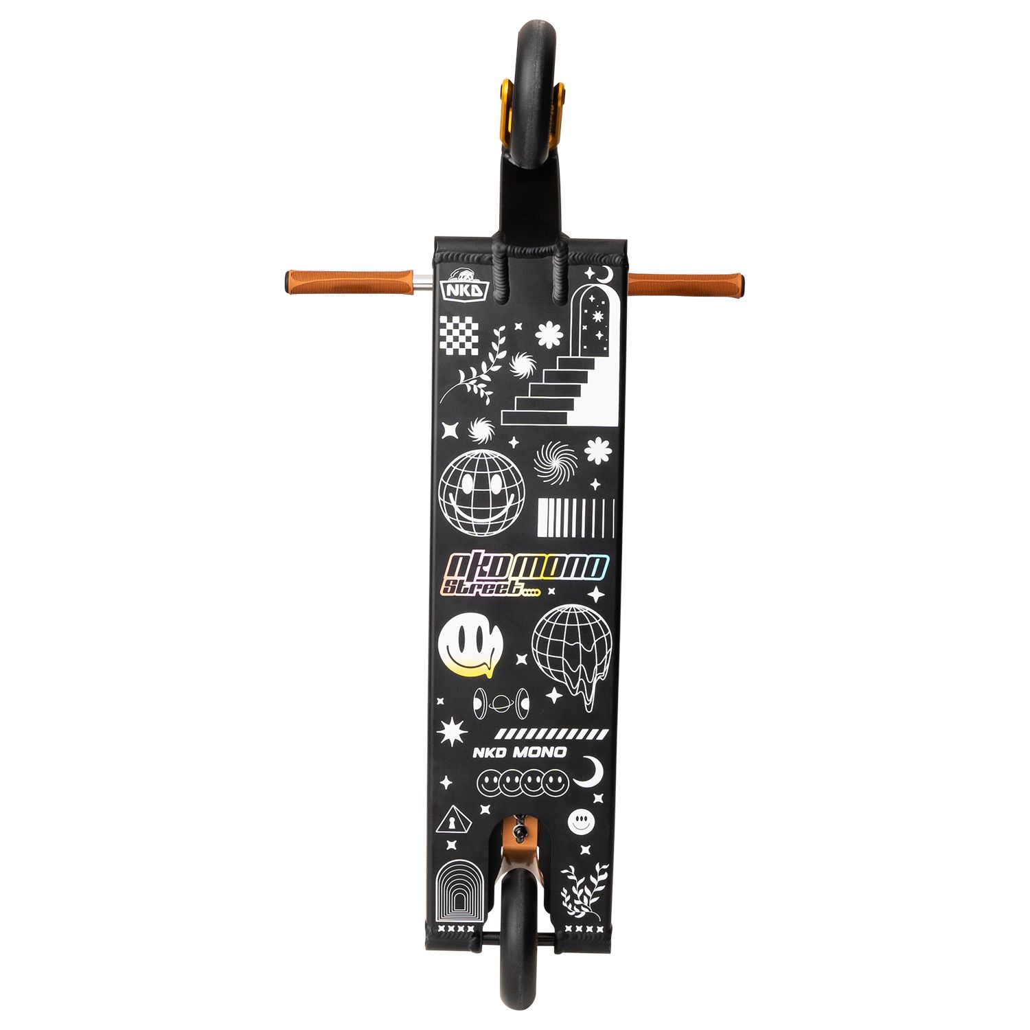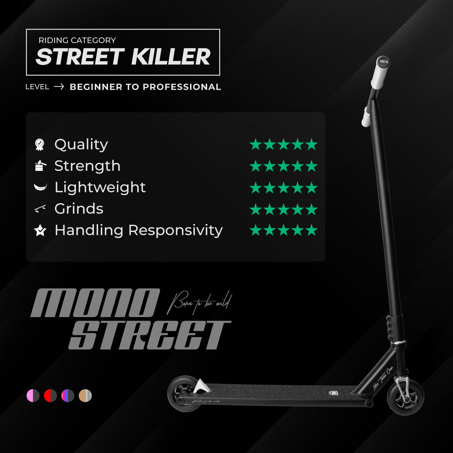 NKD MONO tilbyr et omfattende spekter av funksjoner som maksimerer din trick-opplevelse. Med kvalitetskomponenter som inkluderer barer av Crmo-stål og myke, komfortable TPR-håndtak, samt innovasjoner i materialvalg og design, er det en klok investering for alle som ønsker å dominere gatene med stil og ytelse. Uansett ditt erfaringsnivå, vil NKD MONO heve dine ferdigheter og ytelse til nye høyder med sikkerhet og tillit.