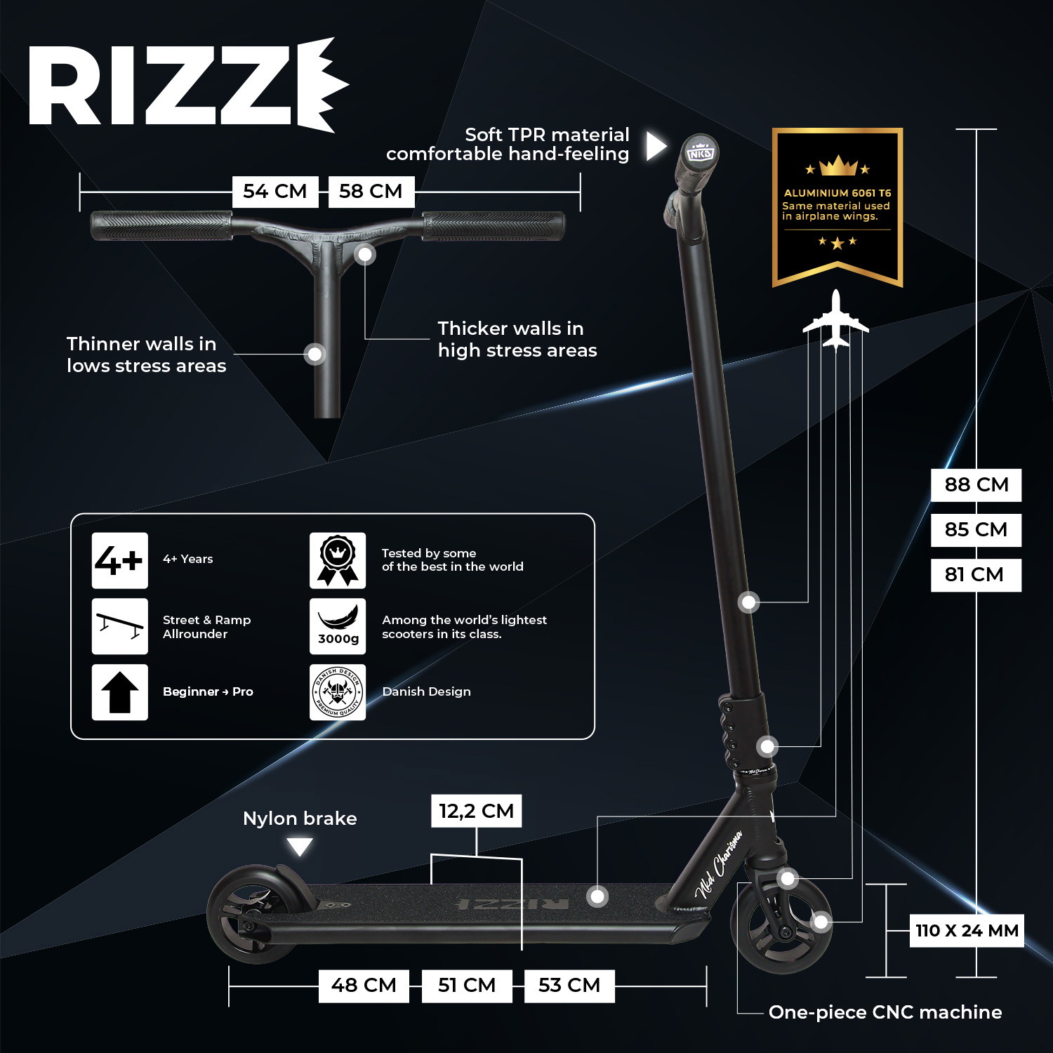 Et godt valg for både helt nye og de med litt erfaring – som ønsker en sparkesykkel som kan vokse med dem og tåle tøffere triks, høyere hopp og mer intens bruk uten å gå på kompromiss med kvaliteten.