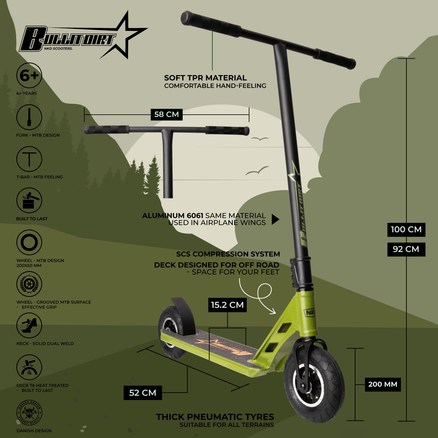 Opplev det ultimate innen off-road eventyr med vår HIGH END DIRT TRICKS sparkesykkel fra NKDscooter, spesielt designet for barn og voksne fra 6 år og oppover. Denne imponerende sparkesykkelen kombinerer robusthet med avansert teknologi og dansk design for å levere en enestående kjøreopplevelse.