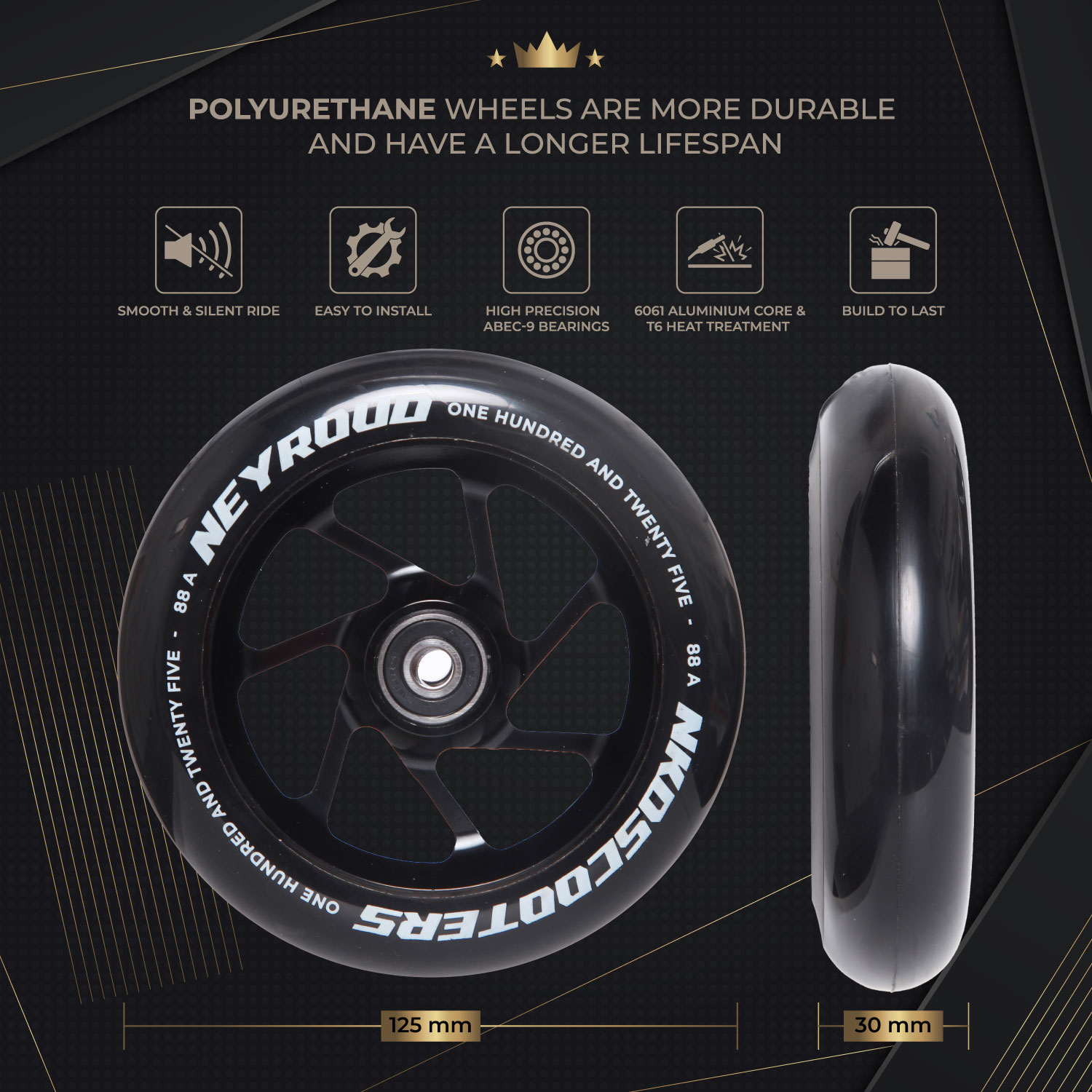 NKD Matis Signaturhjul er laget for riders som ønsker det beste innen fart, grep og holdbarhet. Med en unik størrelse på 125x15 mm, en sterk aluminium 6061-T6 kjerne og premium PU-gummi med hardhet 88A, får du et hjul som leverer høy fart, myke landinger og ekstra stabilitet.