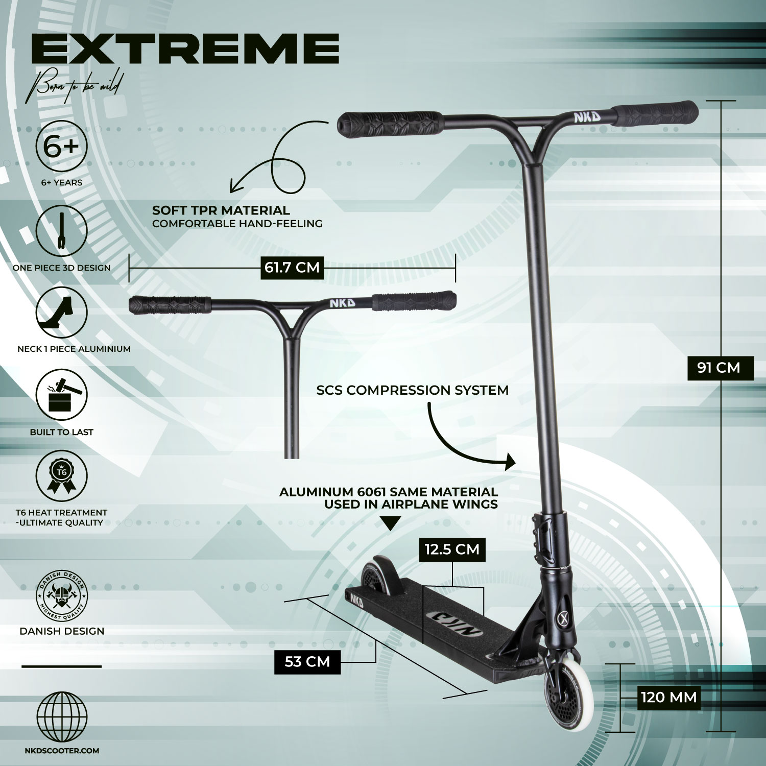 NKD Extreme er den hittil sterkeste trik sparkesykkel. Den er designet for de mest ekstreme sparkesykkel-stunts, og passer både for skatepark og gatetur. Om du er nybegynner eller profesjonell spiller ingen rolle. NKD Extreme kan brukes til å forbedre dine evner, og til hardcore-stunts med mange wild spins. En flott trik sparkesykke!