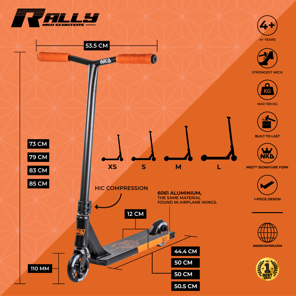 NKD Rally er en trikse-sparkesykkel som anbefales for barn og ungdom i alderen 4+ år. Sparkesykkelen er rettet mot nybegynnere og den erfarne sparkesykkelrytteren. Denne sparkesykkelen er egnet for gatekjøring og skateparker.