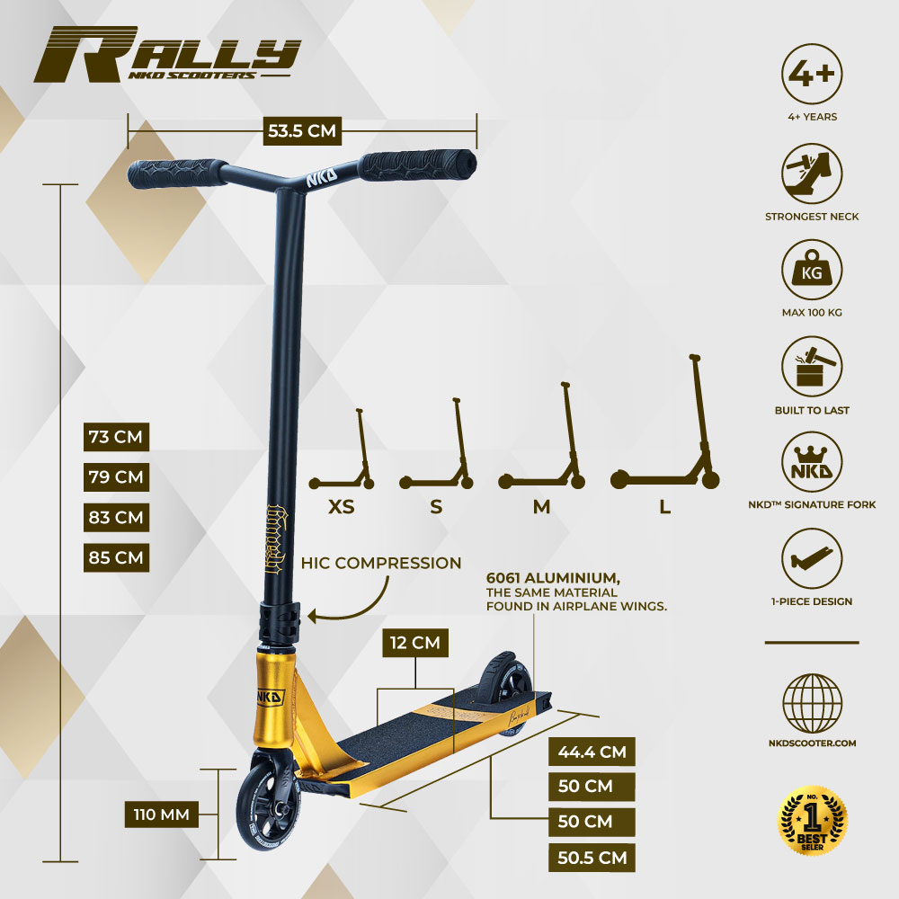 NKD Rally er en trikse-sparkesykkel som anbefales for barn og ungdom i alderen 4+ år. Sparkesykkelen er rettet mot nybegynnere og den erfarne sparkesykkelrytteren. Denne sparkesykkelen er egnet for gatekjøring og skateparker.