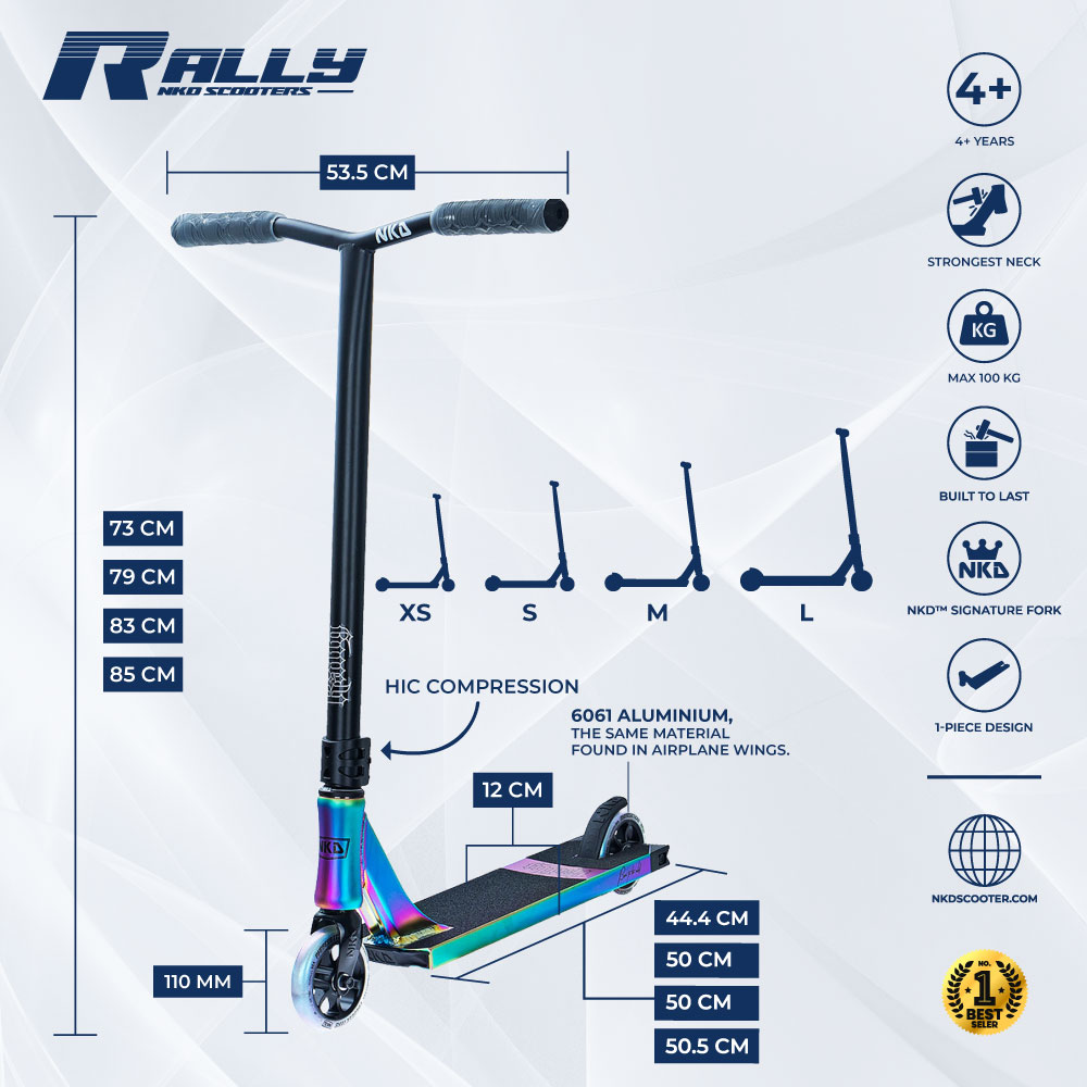 NKD Rally er en trikse-sparkesykkel som anbefales for barn og ungdom i alderen 4+ år. Sparkesykkelen er rettet mot nybegynnere og den erfarne sparkesykkelrytteren. Denne sparkesykkelen er egnet for gatekjøring og skateparker.