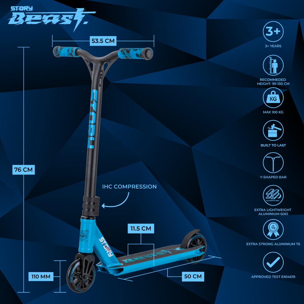 Story Beast er en stuntscooter for alle - både nybegynnere og mer erfarne ryttere. Den er ideell for skateparken og tekniske rampestunts, siden den er både robust og veier nesten ingenting. Gir rikelig mulighet til å presse deg selv med nye spennende stunts og manøvrer.